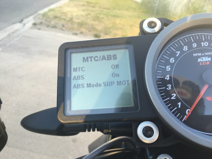 MTC is KTM’s traction control and can be set either “on” or “off”. ABS has 3 modes, “on”, “off” and “Super Moto”.After about a half hour of getting familiar with the bike in sport mode and with traction control and ABS fully enabled, I pulled over and disabled TC, then put ABS into Super Moto mode -this allows the rear tire to lock up under braking but keeps ABS enabled for the front. It’s worth noting that the traction control on this motorcycle is on the primitive side, compared to Aprilia, BMW or Ducati’s offerings: it’s either everything on, or everything off on the KTM and there is no way to adjust sensitivity of intervention level. For novice or intermediate riders, this may not be an issue, but advanced riders will want more control over the system. In everyday riding, it would probably make sense to just leave the electronics on but on the racetrack, it would be more of a struggle as having no electronics whatsoever could be a handful with so much torque on tap and the bike leaned over constantly. I digress -most people who buy this motorcycle probably will not be taking it to the racetrack but even for aggressive street riding, I would ride this bike with traction control completely disabled. Another gripe that became apparent is that the electronics system resets itself every time the bike is turned off, so stopping for fuel or lunch will require you to go back through the (albeit intuitive) menu system and set everything back up, every time. That is, unless you buy a $125 peripheral “accessory dongle” from KTM, and even then, you can only get the bike to retain TC and ABS modes, not ride mode. For a $20K bike, I simply cannot fathom this oversight on KTM’s part.