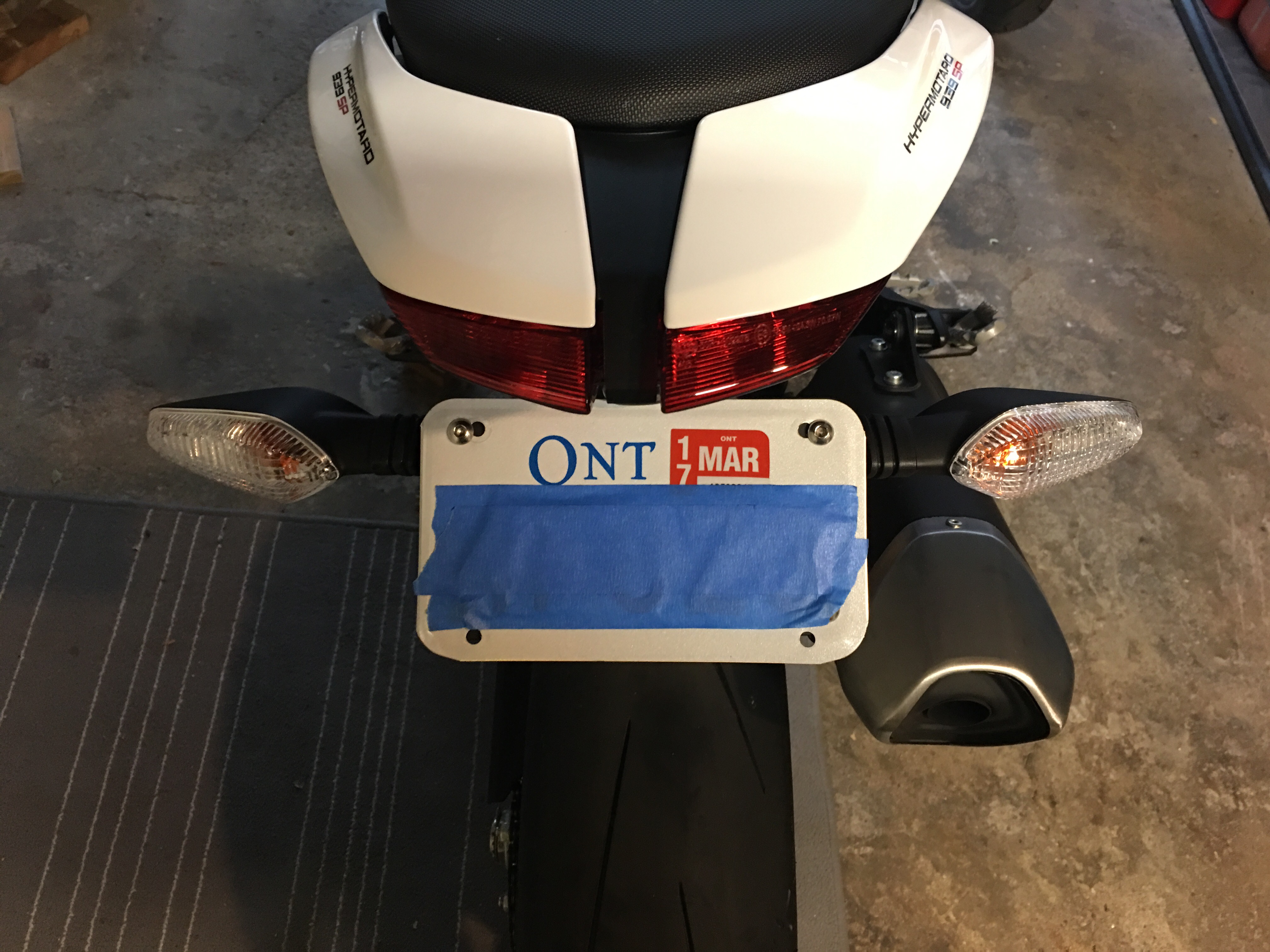 In the case of our Hyper 939 SP, the faux-fender is simply held on by 4 hex bolts under the tail. Pulling those releases the fender, turn signals and license plate light in a single assembly. The turn signals and license plate light all have quick connects and are easily removed. The Motodynamic tail tidy is compatible with the stock turn signals (we may fit some LED turn signals at a later date but the stock ones are fine for now). For now, removed the signals so that they could be mounted on the new bracket.