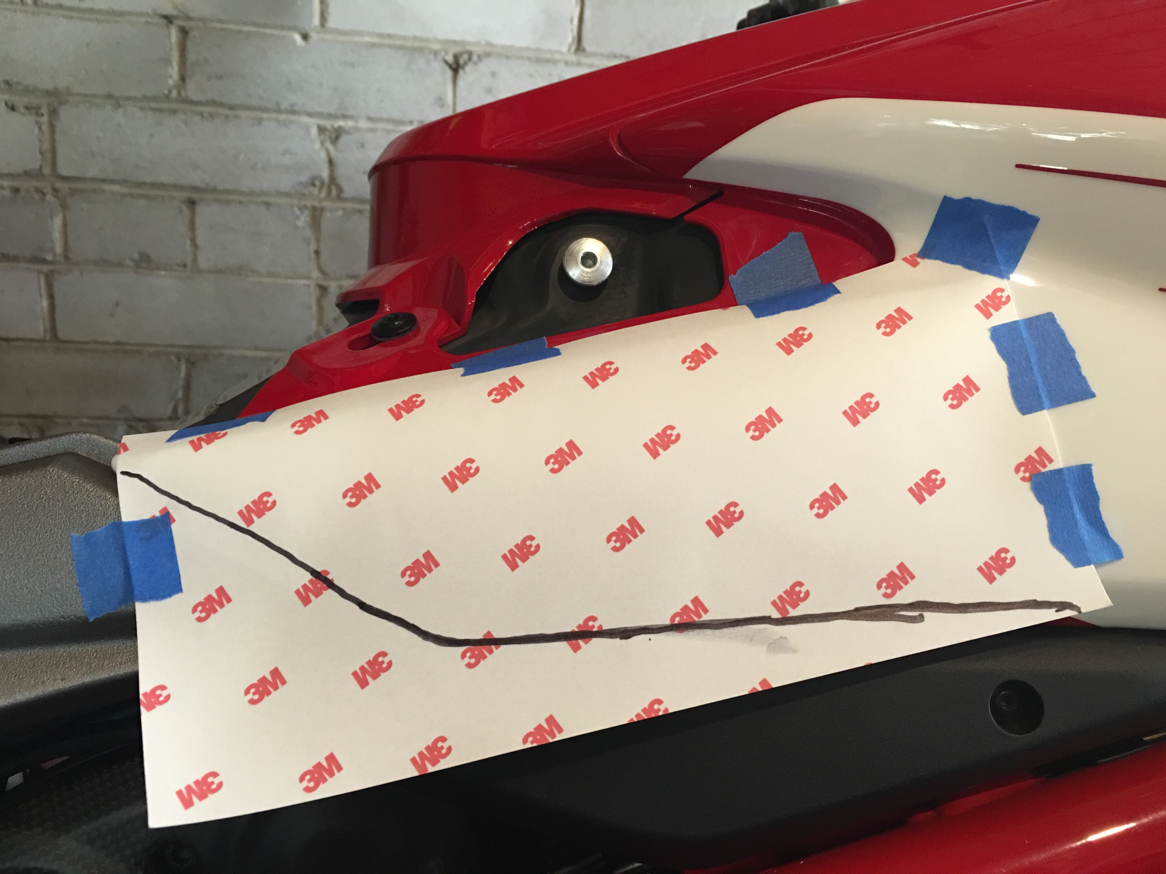 Step 4: Since the Hypermotard panels are exact mirror images of each other, you can save yourself some time by using the shape you’ve already created and cutting out the reverse template other side (just keep in mind which side is up so you mark it correctly).