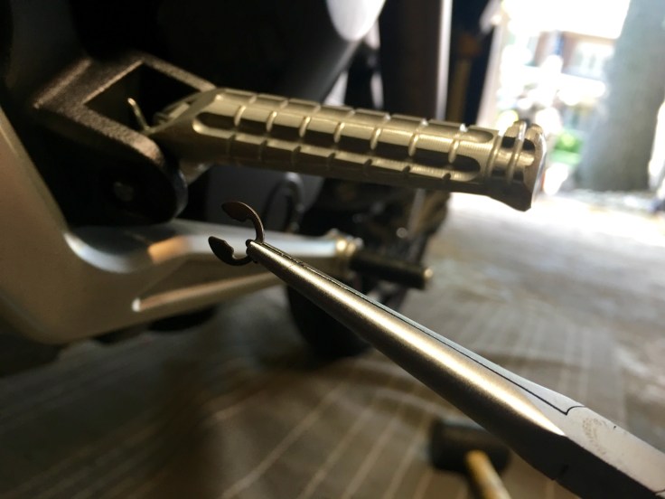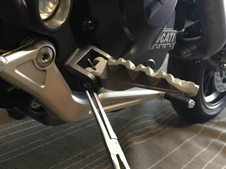 Step 5: The last step is to re-attach the c-clip to the pin. You can re-use the stock clips if they are still straight. Alternately, the Ducati Performance footpegs come with new clips. The easiest way to re-attach the clip is to grab it in the center with the needle nose pliers (as shown below) and it should slide on without much hassle.
