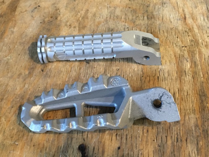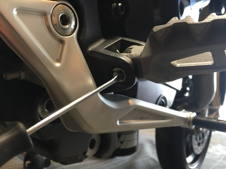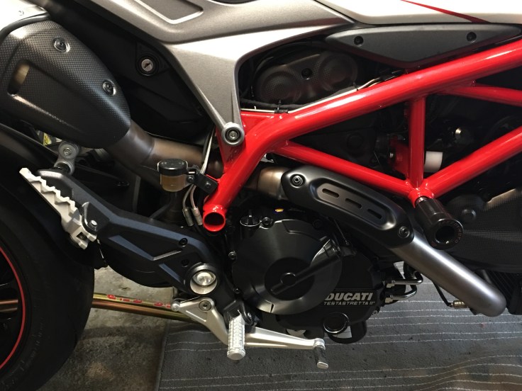 Ducati’s Hypermotard platform is arguably its most versatile, featuring models that can do everything from touring (Hyperstrada), street riding (Hypermotard) and track duty (Hypermotard SP). What’s unfortunate however is that Ducati outfitted all 3 bikes with the same footpegs. Under normal riding conditions, the stockers are up-to-task, but push closer to a racing pace and their limits of shape and grip immediately become apparent. For this reason, we sourced a new set of pegs for our Hypermotard 939 SP project bike and settled on the Ducati Performance aluminum racing pegs (part #96280121A). Not only do they provide a gripper surface, they are more compact, lighter, look trick and maintain the folding feature of the stock footpegs.