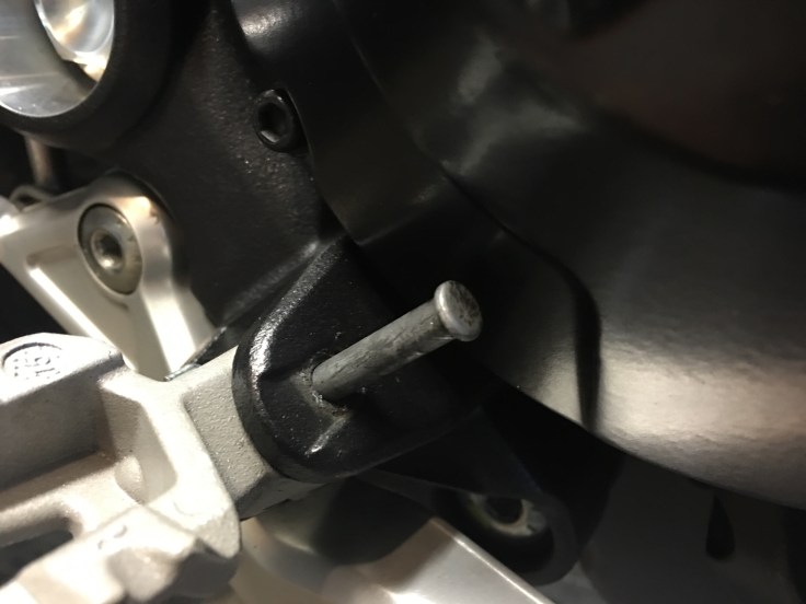 Step 2: Remove the pin that holds the stock pegs on the bike. As you do this, take note of the location of the return spring and be sure to catch it when the peg comes off as you’ll need it later. There’s only a few millimeters of clearance between the pin and the clutch cover on the right side. Take your time and you can clear it without scratching anything.