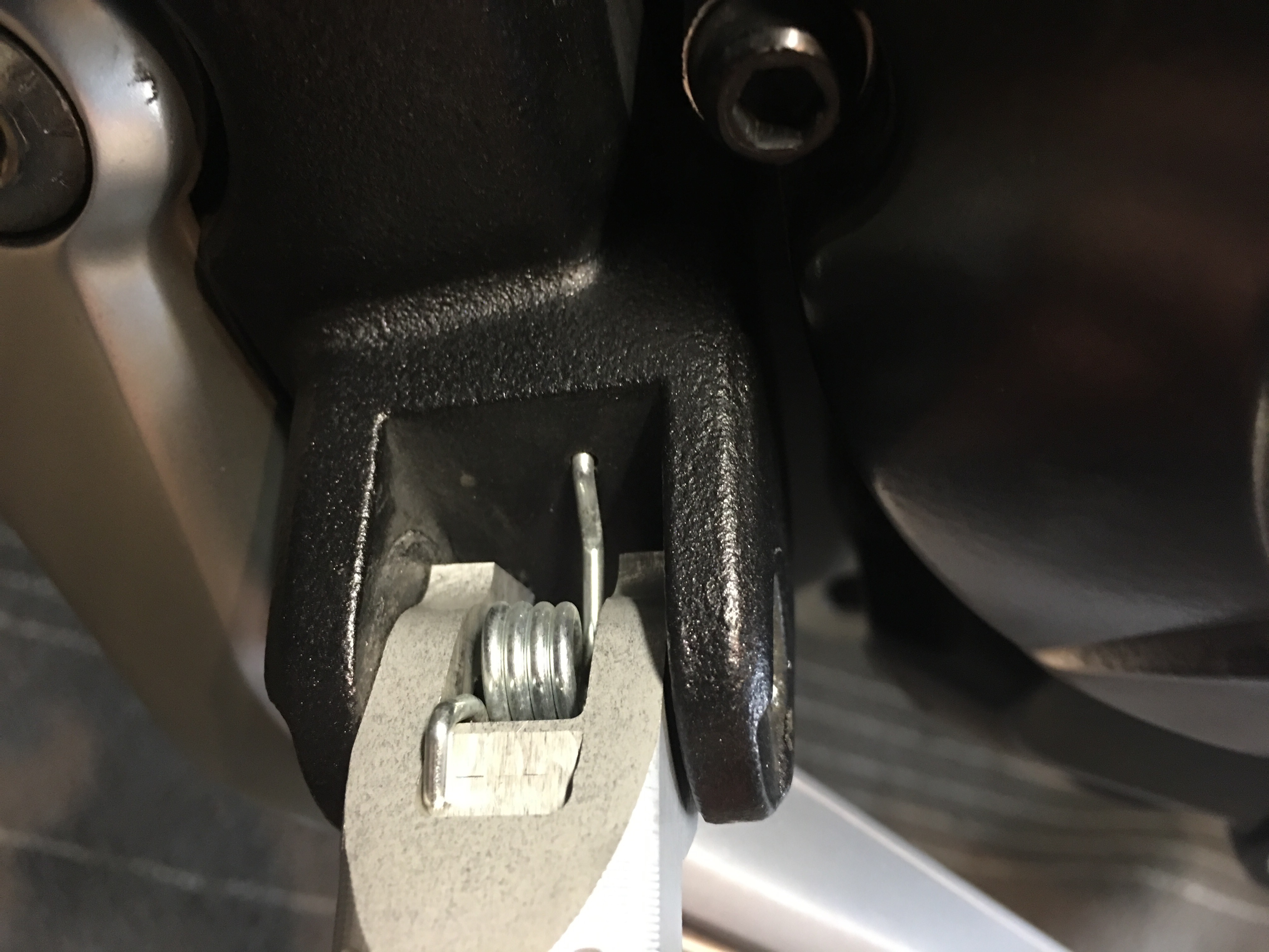 Step 4: The next step is to mount the new pegs (remember that the pegs are directional meaning there’s a left and a right side). The spring from the stock setup has 2 ends: one goes in a hole on the bracket and the other sits on top of the aftermarket peg (as shown below). Getting the pin back in requires compression of the peg inward and upward. Before trying to ram the pin through blindly, move the peg around and look through the holes to get them aligned. Once you’ve got them straight, it shouldn’t require too much effort to get the pin through. Pliers, the newly applied grease and a little jiggling of the peg should be enough.