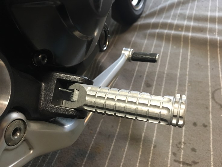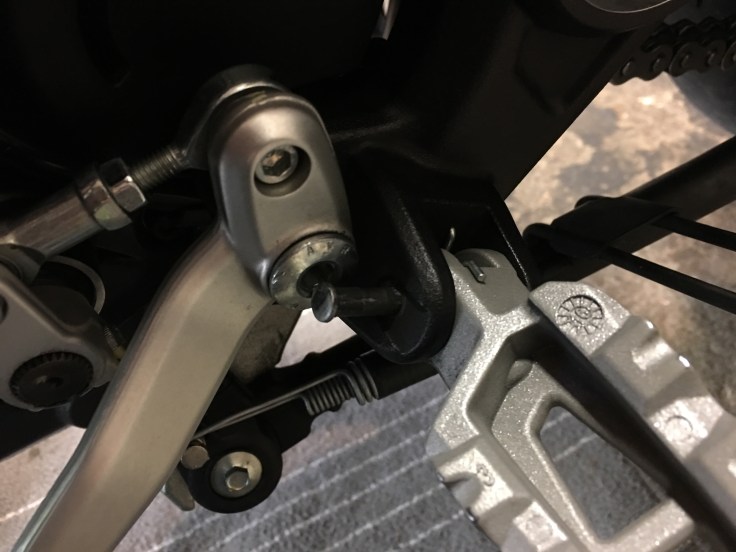 Getting the pin out on the left side of the bike is even tighter but it can be done without removing (or scratching) the gear shifter if you are careful. For stubborn pins, you can use a punch and mallet while working the peg through its range of motion.