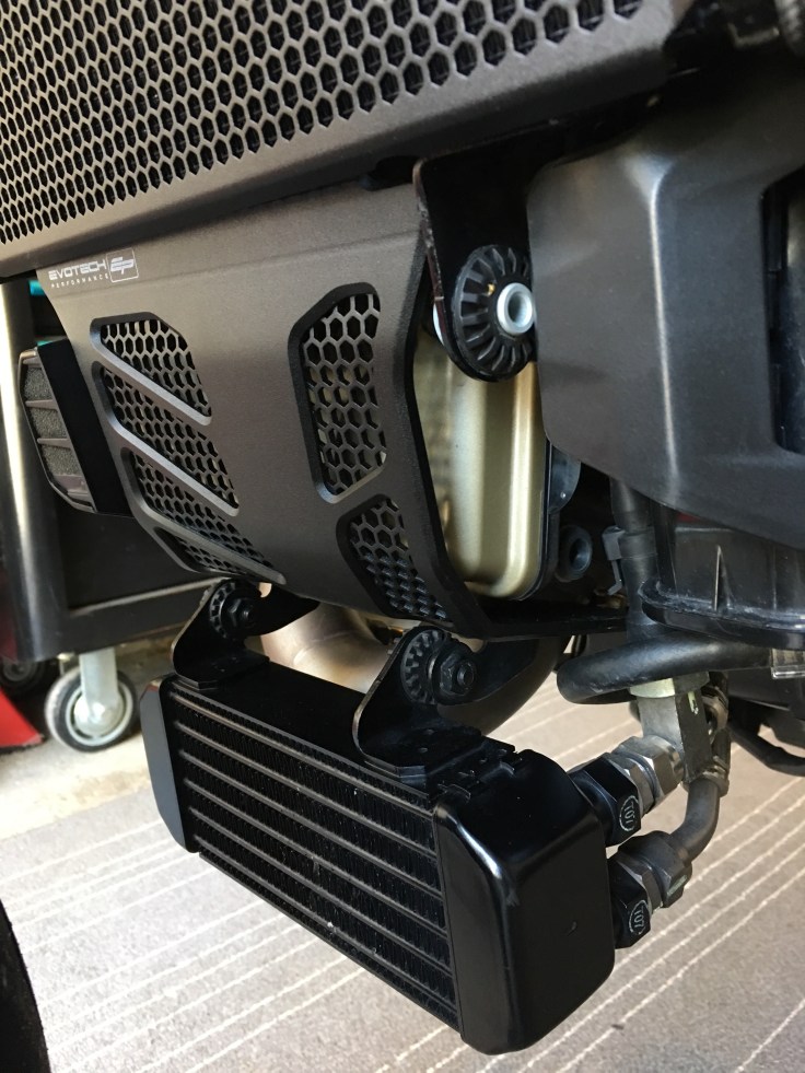 As you can see above, the oil cooler is relatively untouched by road debris (so far), so we will continue to watch it and perhaps add the Evotech Oil Cooler Guard at a later time if it starts showing wear.