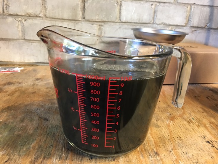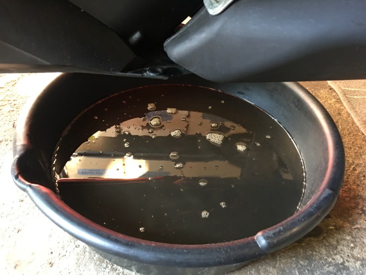 By now, most of the oil should have drained from the bike. If you’re curious (or anal) like we are, you can measure the amount that came out to ensure you fill it to the correct level (assuming of course that it was filled to the right level to begin with).