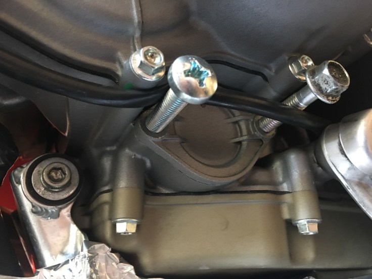The cover fits very snugly and requires a lot of leverage to get out. On later model Panigales, the cover itself is threaded larger than where the bolts you just removed meet with the motor. This allows you to use two M8 bolts (you’ll have to supply them) as levers to gently pull the cover off. Beware that prying with screwdrivers will mar the engine cases and could damage the cover or create a leak. If you have an older model Panigale (early model 1199 for example), you can fabricate some hooks out of a coat hanger and use those tools to pull the cover off from inside the bolt holes.