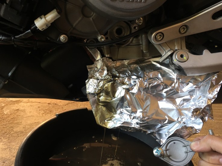 Before you remove the cover, it’s a good idea to use something like tin foil to cover the exhaust. The oil from the filter will run down the side of the exhaust otherwise and could actually catch fire when you ride if you don’t clean it up properly.