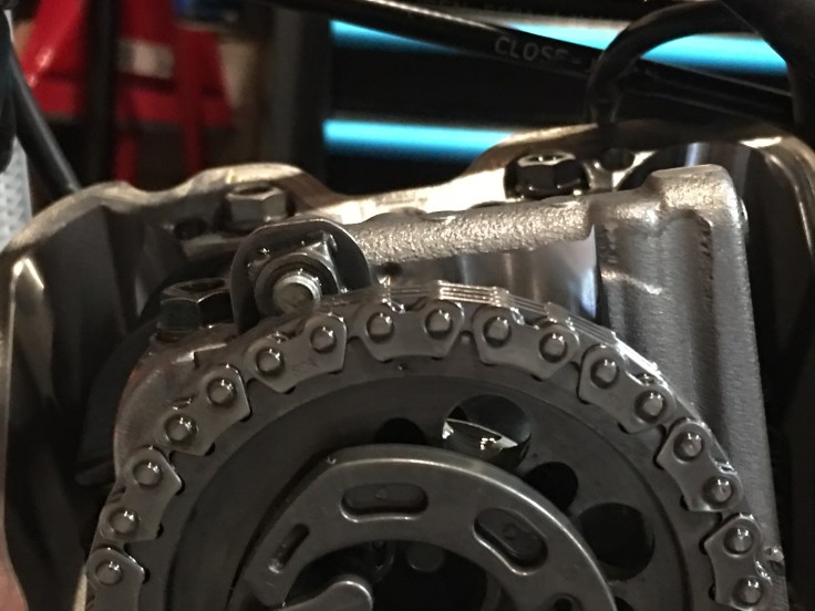 The first step of checking the valves is to remove the head cover (secured by 4 bolts). Next, align the mark (recessed dot) on the cam timing chain with the similar mark on the motor (larger recessed dot) by turning the back wheel with the bike in gear (this is much easier with the bike on a center stand).