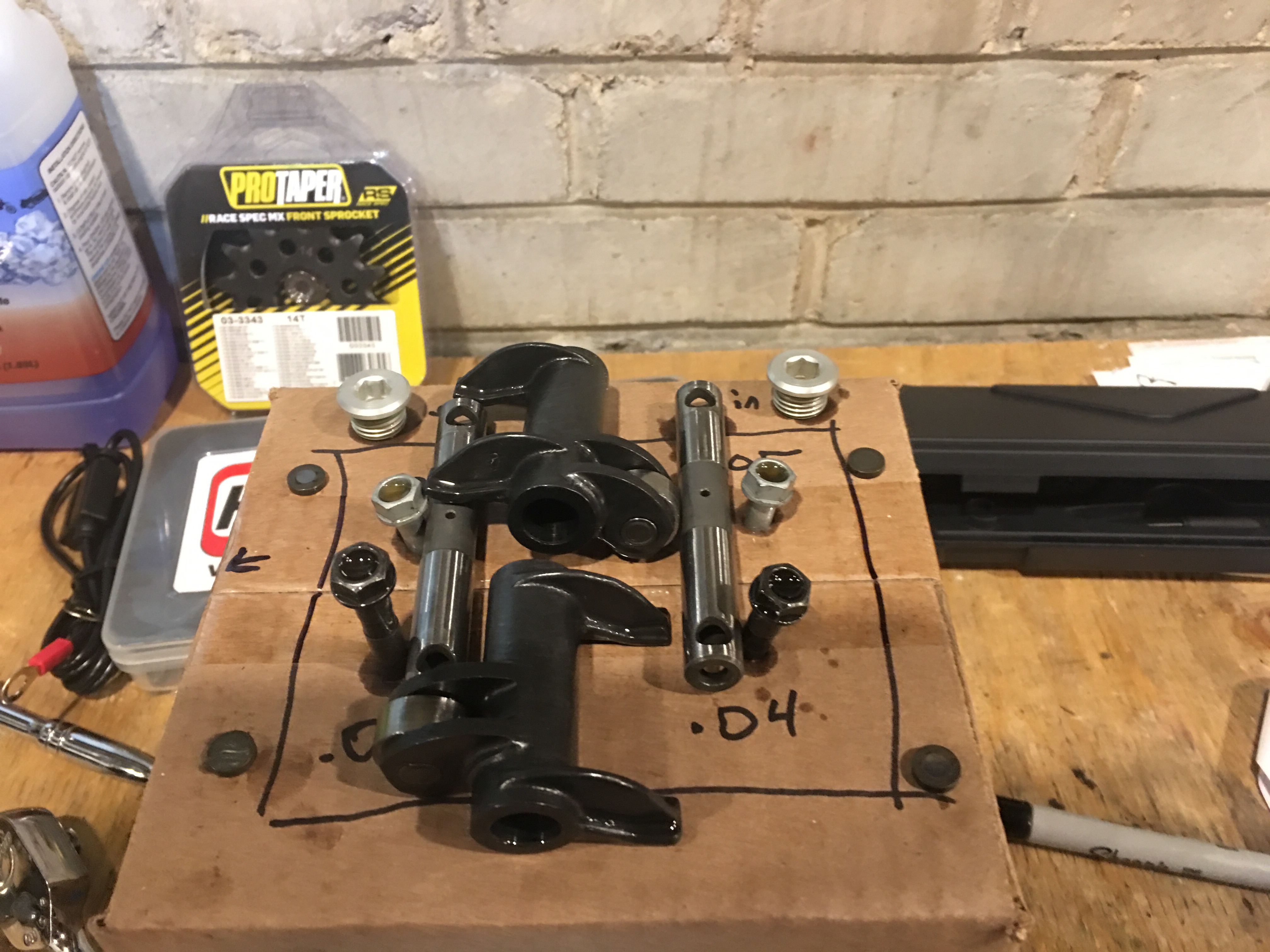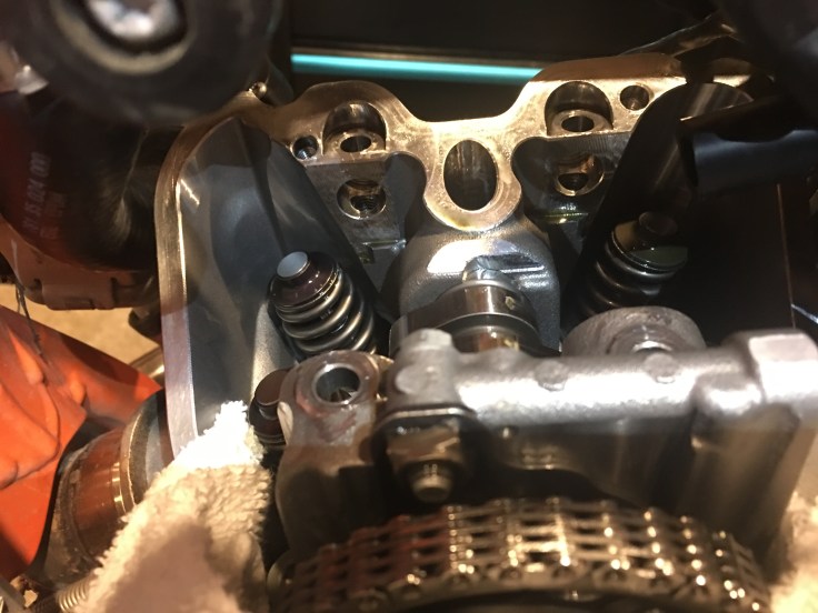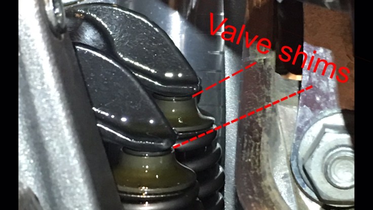 In our case, the bike had never had its valves checked and at 2,000 kms of street riding, all 4 of the valves were tight and out of spec. We pulled out the rocker arms and all 4 of the shims so we could measure and replace with the correct shims.