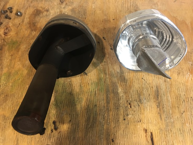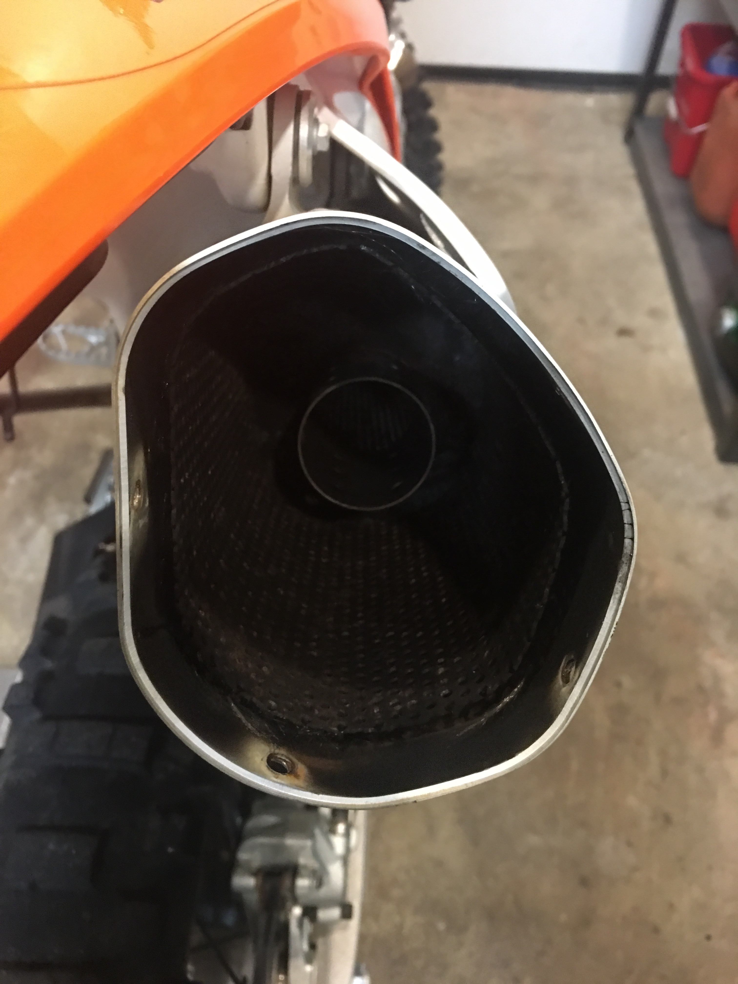 Looking down the barrel of the muffler, you can see how the STE-2 end cap lines up exactly with where the gas enters the muffler from the header pipe, resulting in less restriction.Aesthetically, the new end cap adds a bit of “bling” to the bike without screaming “I’m aftermarket”. The resulting sound is only about 10% louder than stock and the cap comes with a “quiet” insert which restricts the flow and brings sound levels down to the same as the stock unit.