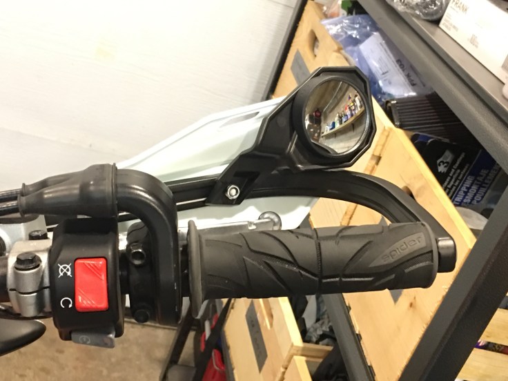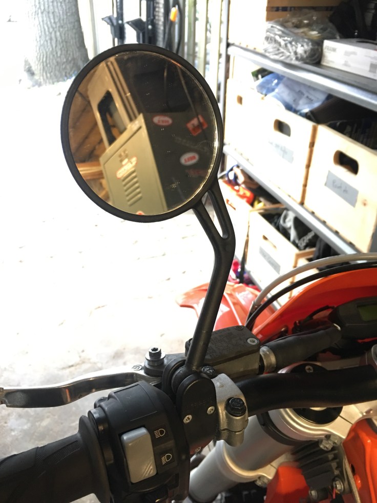Although not explicitly designed for this application (they are actually used on ATVs and snowmobiles), the mirrors can easily be mounted, using the bolt location on the inside of the hand guard and providing a decent view of the rear. The round, convex mirror can be rotated to achieve the desired view while still maintaining a clean sight line across the handle bars.
