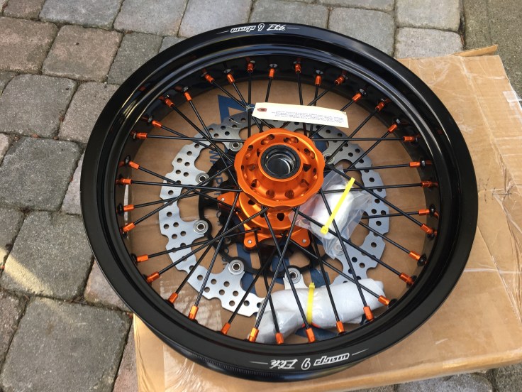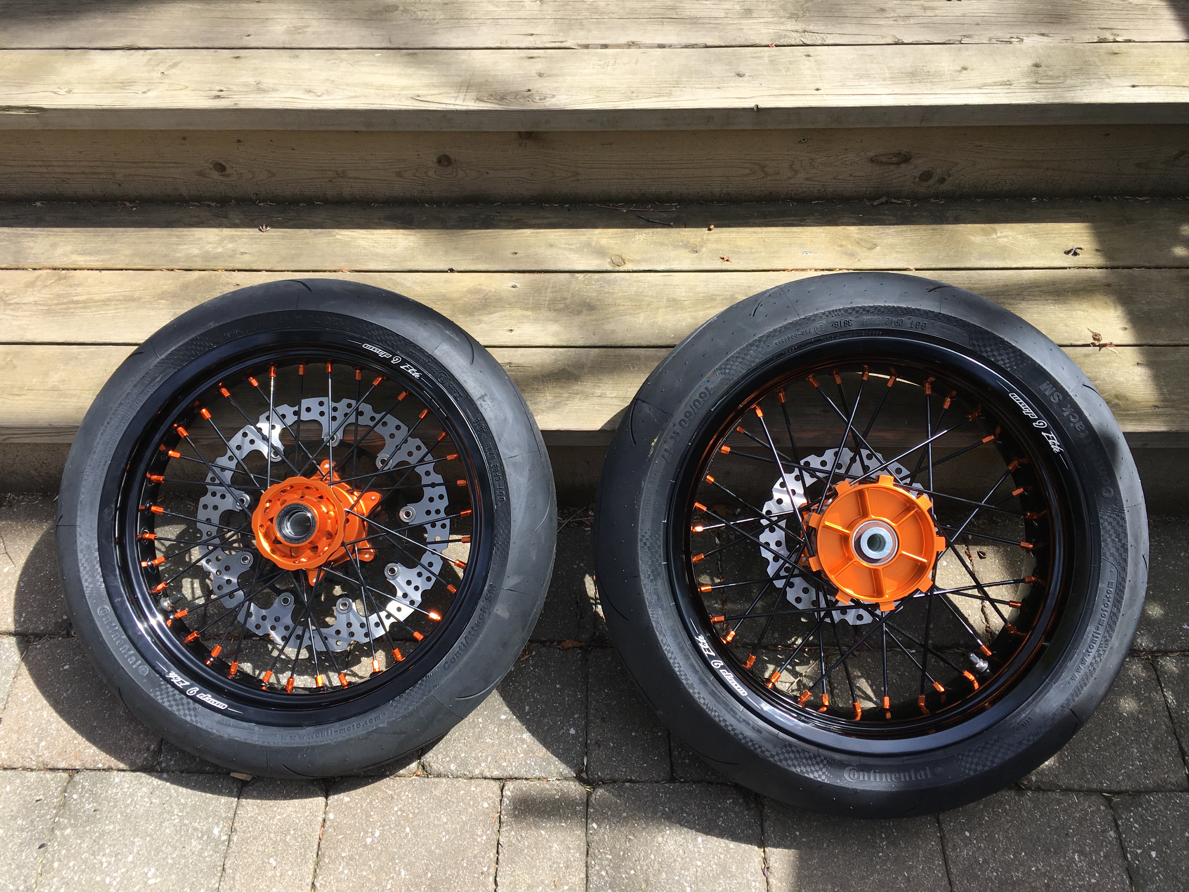 Is it just us or do clean bikes actually run better?Wheels & Tires: The defining characteristic of a supermoto are its spoked wheels so we put a lot of time into researching various manufacturers and local suppliers. The bad news is that Canada is a niche in itself for the niche that is supermoto, and that even near the largest city in the country (Toronto), that suppliers were few and far between. After considering all options for cost, quality, shipping, customs and weight, we settled on a set of custom Warp 9 Elite wheels in black, with orange hubs (cush drive in the rear) and spoke nipples.