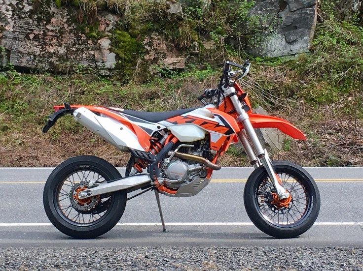 Verdict: In the end, the KTM 500 EXC is a purpose-built animal, designed to provide the best dirt biking experience to anyone who needs to do an occasional bit of tarmac. Turning it into a strictly asphalt-going machine has its merits but is not without its share of trade offs. For one, the maintenance intervals (oil changes and valve check primarily) come quickly when doing road miles and the all-in cost of this unique supermoto is close to a comparable (arguably better), dedicated factory machine such as the Husqvarna 701 Supermoto, KTM 690 SMCR or Ducati Hypermotard. Many have also converted the KTM 690 Enduro to supermoto with good results, preferring the characteristics and maintenance intervals on the larger displacement single. If you plan on riding on the tightest, twistiest of roads, don’t mind doing a little maintenance, aren’t overly concerned with budget and want something unique, there is definitely merit in considering a KTM 500 EXC supermoto project of your own.