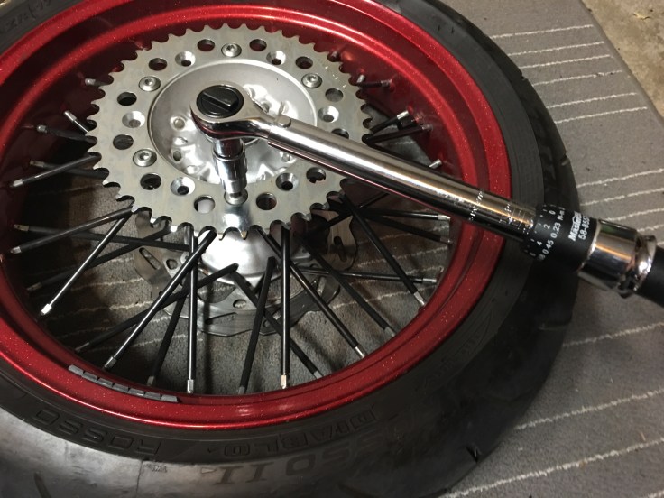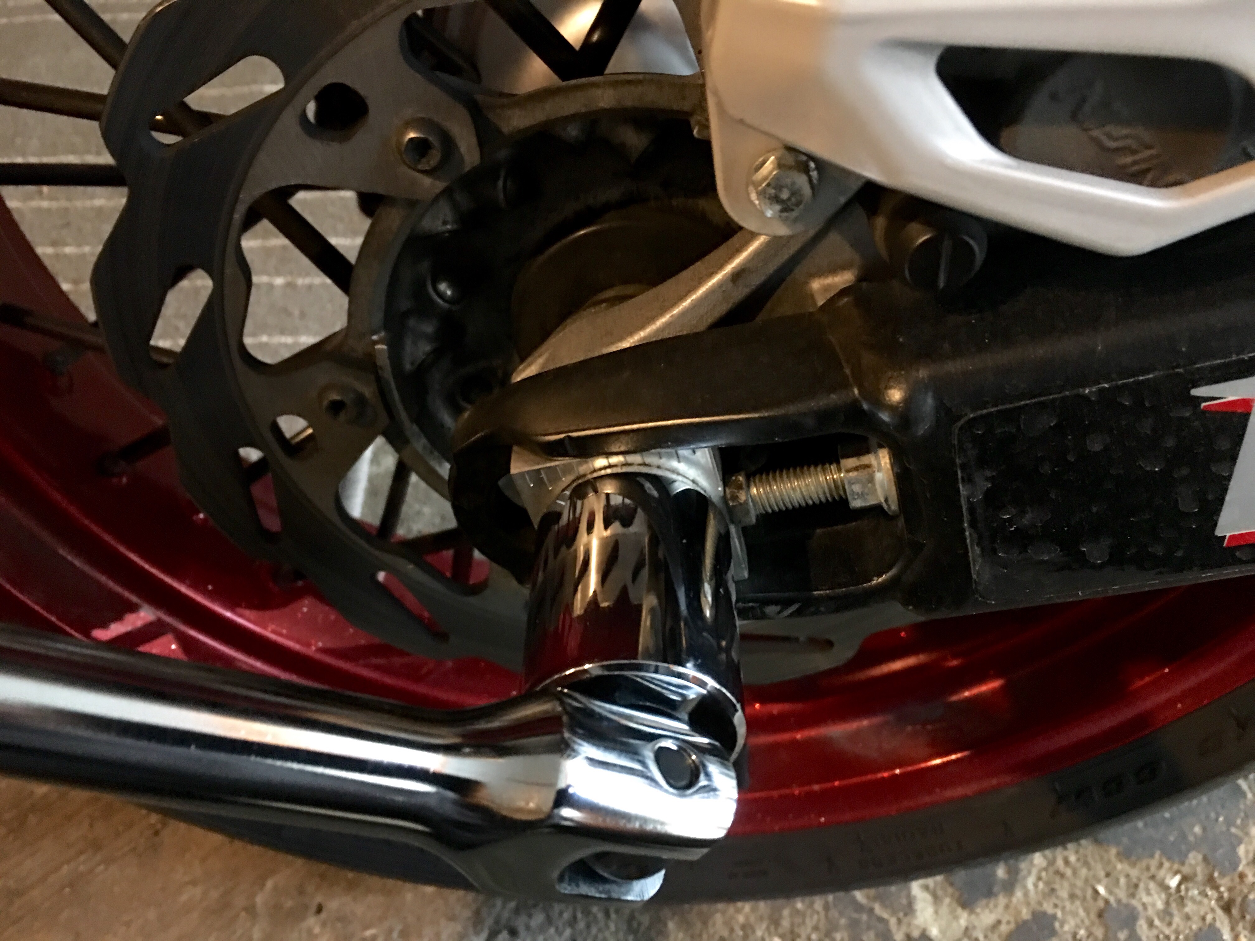Step 2: Before putting your bike on a rear stand, break the rear axle nut loose. If your bike happens to have a single-sided swingarm, the procedure can be tricky as the wheel is usually held on by a single (large) nut that’s torqued to a really high value. For any case of rear-wheel-nut stubborn-ness, a handy trick is to let some air out of the rear tire or even deflate it completely. Applying the rear brake should then be enough to break the nut loose, without the wheel spinning. Having a friend/significant other around to help is always welcome.