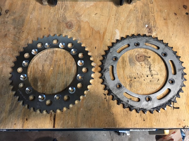 Step 10: Install the new rear sprocket. Before bolting the new sprocket on, it’s a good idea to do a quick side-by-side to ensure the sprocket mounting points line up.