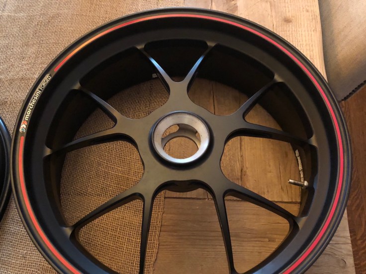 - Marchesini forged aluminum wheels (after powedercoating): Front 6.9 lbs (with bearings), Rear: 8 lbs
