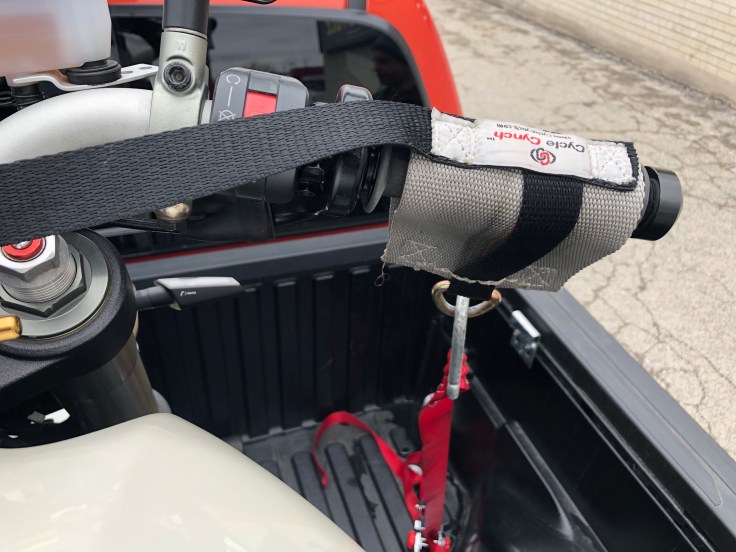- If the kickstand is down, remember to put it up before you tighten the straps (otherwise, you can end up with a dent/hole in the truck bed)