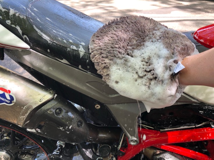 - If you have an older wash mitt (or cloth), use that one for the really dirty parts such as the wheels, motor, tires, exhaust and underbelly