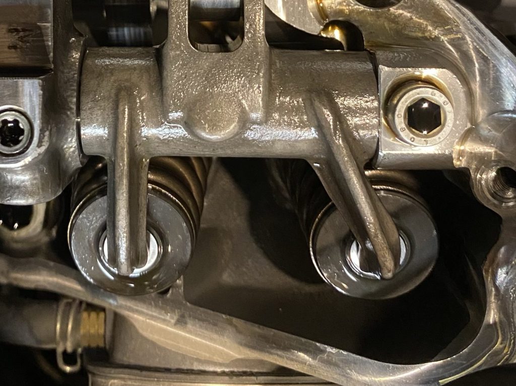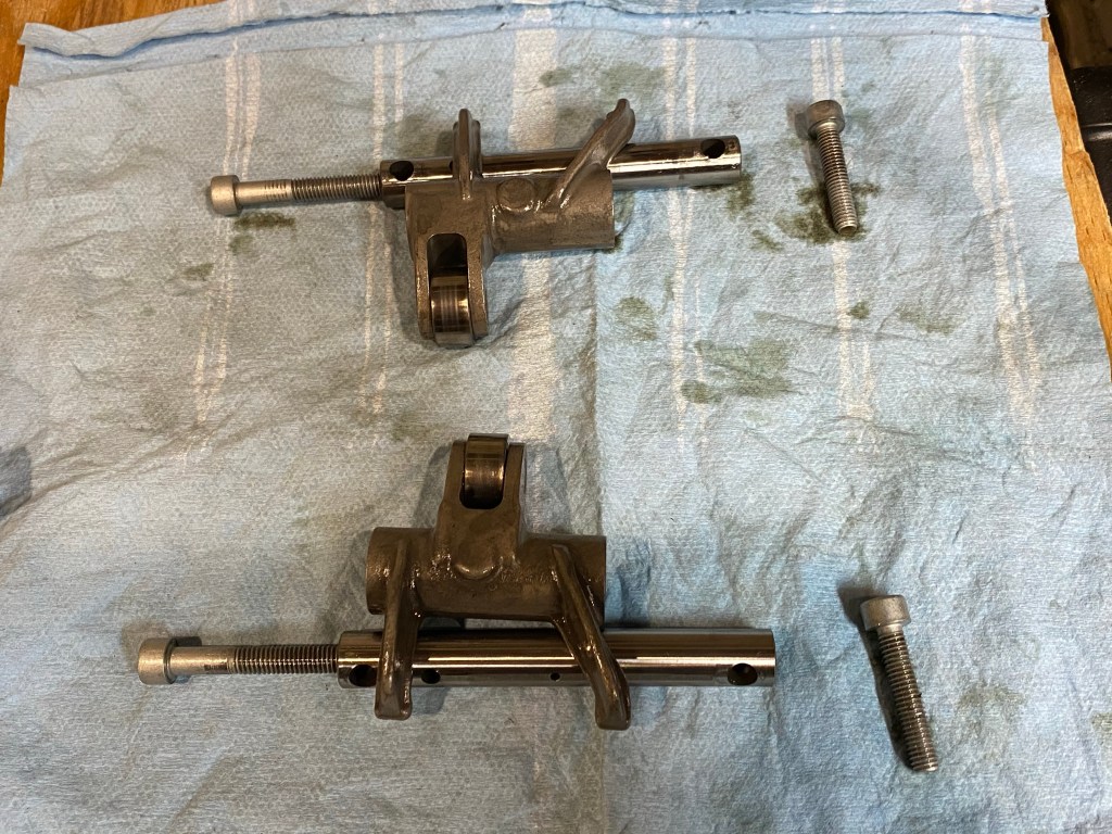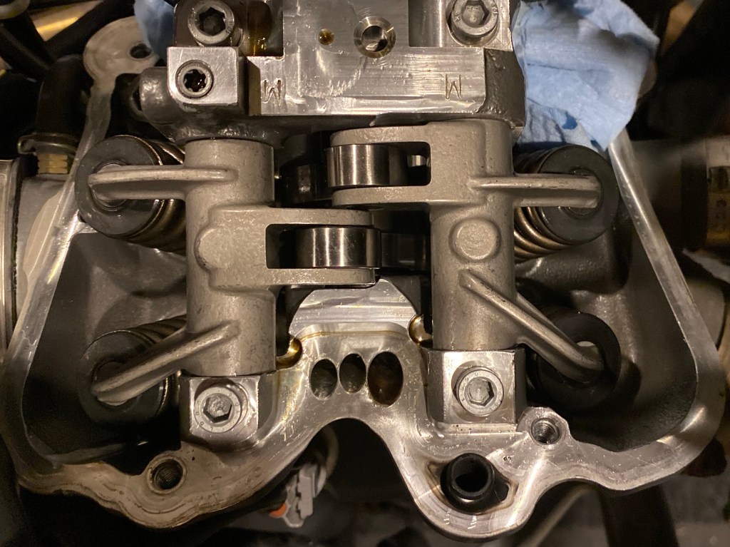 Replacing the shims requires the removal of the rocker arm of the corresponding side. For example, if your valves were only out of spec on the intake side, you can remove that side only. There are 4 hex bolts that secure the rocker arms (as shown below). Once the bolts are out, the rocker arms will be held in by metal shafts which must be extracted through the aforementioned holes in the can timing gear (left side of the bike).