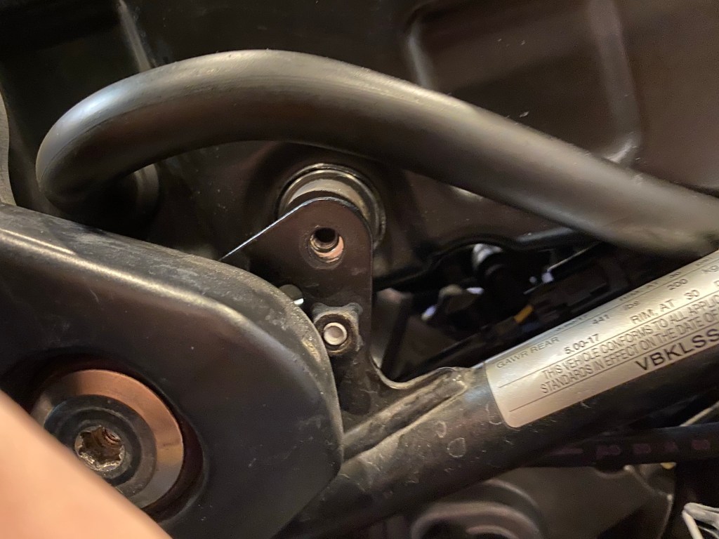 To gain access to the front right bolt, you will need to remove the voltage regulator. The bolt can then be accessed through a hole in the panel behind it.