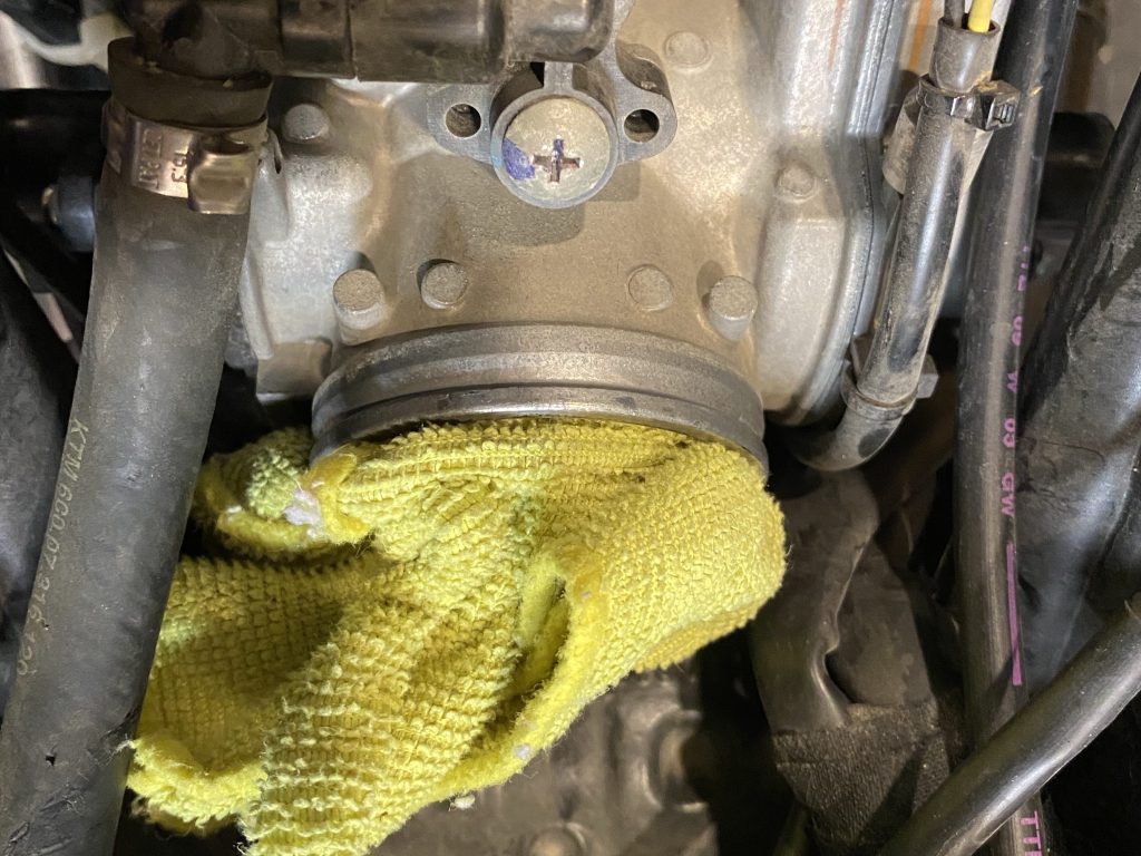 With a clear view of the valve cover, begin by stuffing a clean rag into the throttle body opening to prevent debris from getting in.