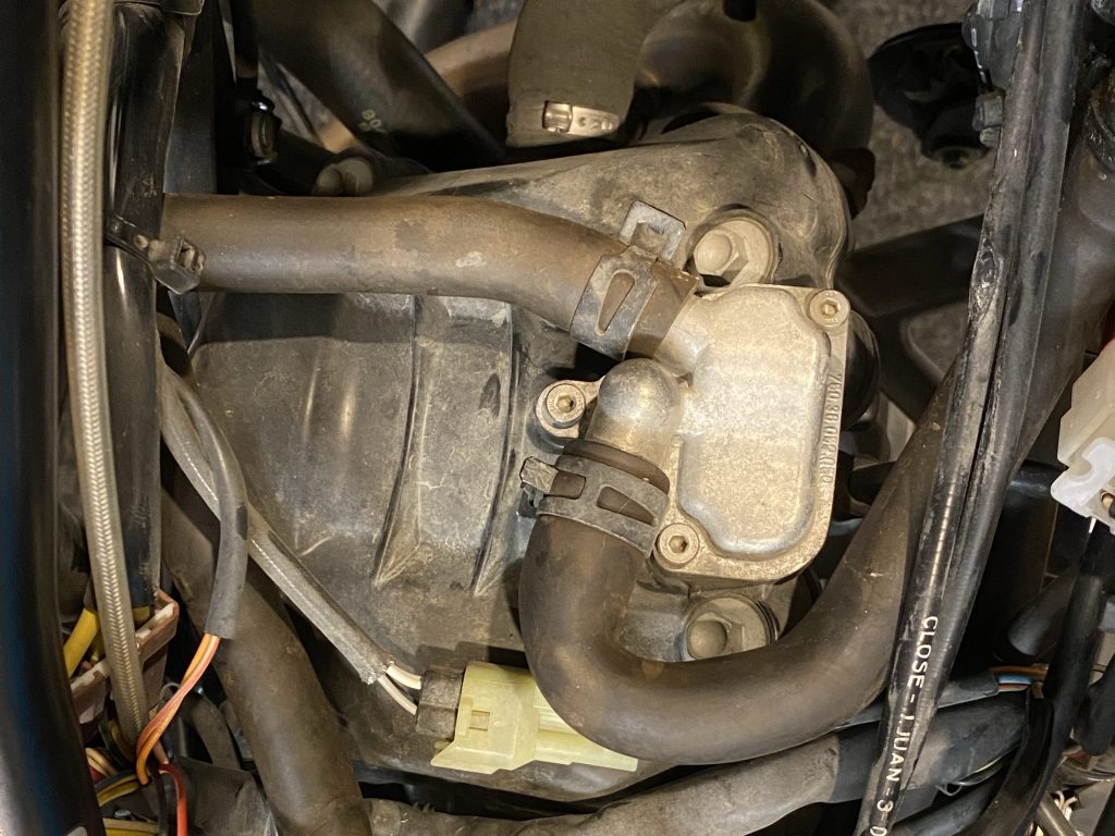 With the 4 bolts removed, you will need to disconnect the breather hoses and O2 sensor wire, located on the left side of the airbox. The hoses are held on with clamps which are easily removed with pliers. The O2 sensor cable is a “press & pull” style clip.