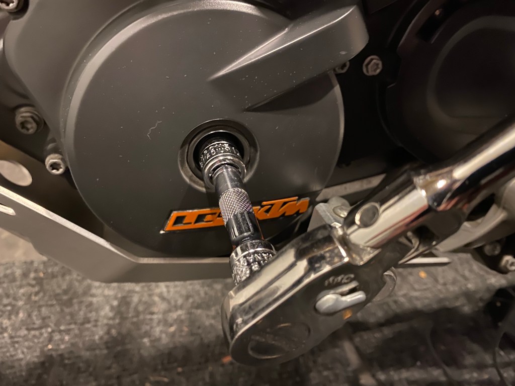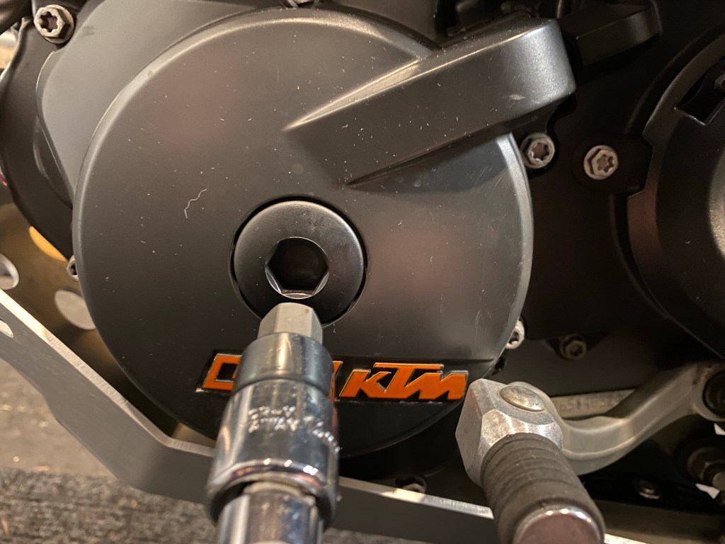 Measuring the valve clearance is actually the easy part of this DIY (getting access to the valves is a lot more work!). Check the tolerances for your bike in the owner’s manual (in the case of the 690 SMC, it’s between 0.07 and 0.13mm). Note that tolerances must be measured cold so if you’ve just gotten back from a ride, wait at least a few hours for the bike to cool down before measuring.