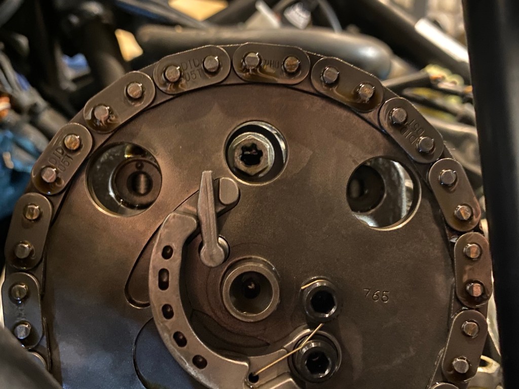 Of the 3 cam sprocket holes, you are looking to align the middle hole with the faint mark under the bolt as shown in the image below. You will also feel the motor “settle” at TDC and it will easily fall to either side when you apply force to the ratchet.