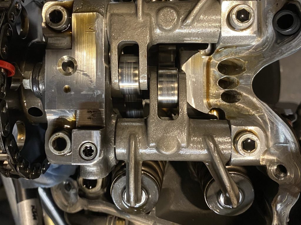 This is a good time to inspect the rocker arm(s) for wear and determine if replacement is required. The main failure point of the rocker arm is the bearing. Check the bearing by rotating it and pressing it to each side. It should have very minimal side-to-side play and no rotational play at all.