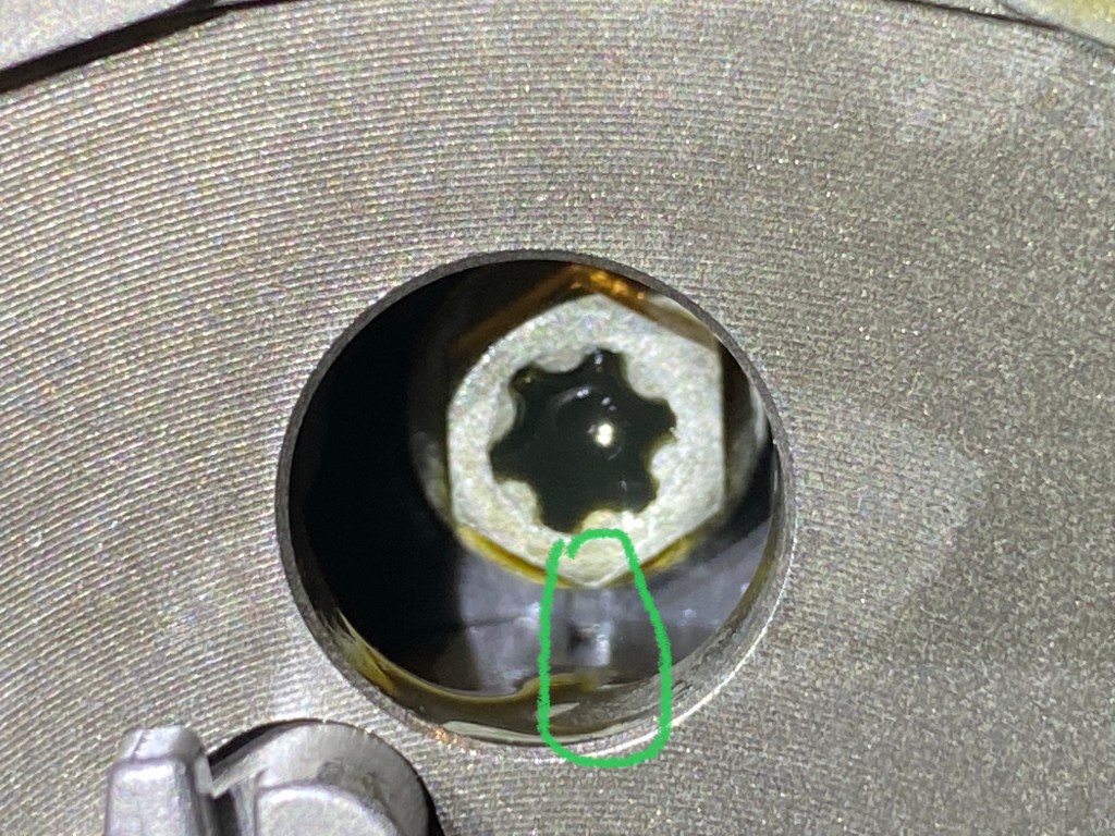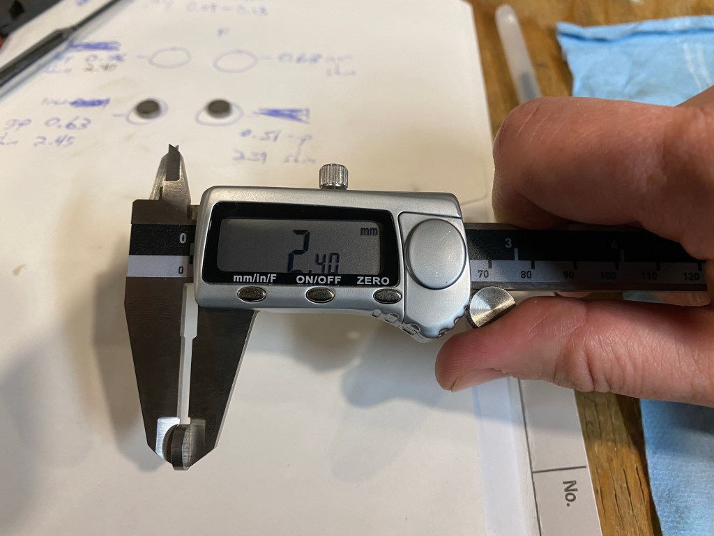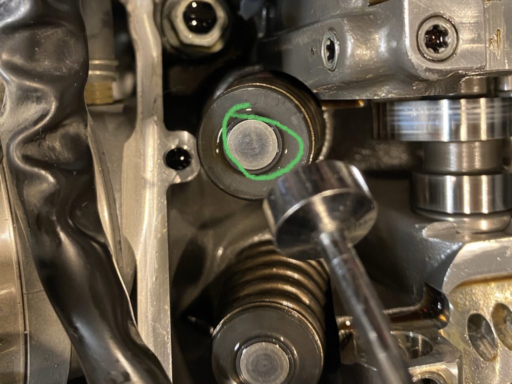 The first step of installing the new shim is to measure the new shim to confirm thickness. Make sure you have rags stuffed in any holes in the motor, just in case you drop the little metal shim. Carefully, press the shim into the seat. It should click firmly to confirm it’s properly seated. Repeat for all shims you are replacing.