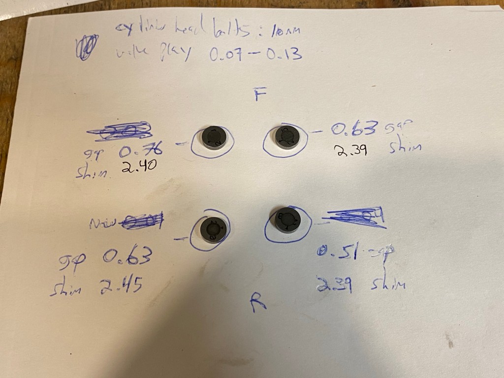 Calculate the new shim values using the formula: new shim thickness = (old gap + desired gap) – old shim thickness. See table below for an example where all 4 shims were replaced.
