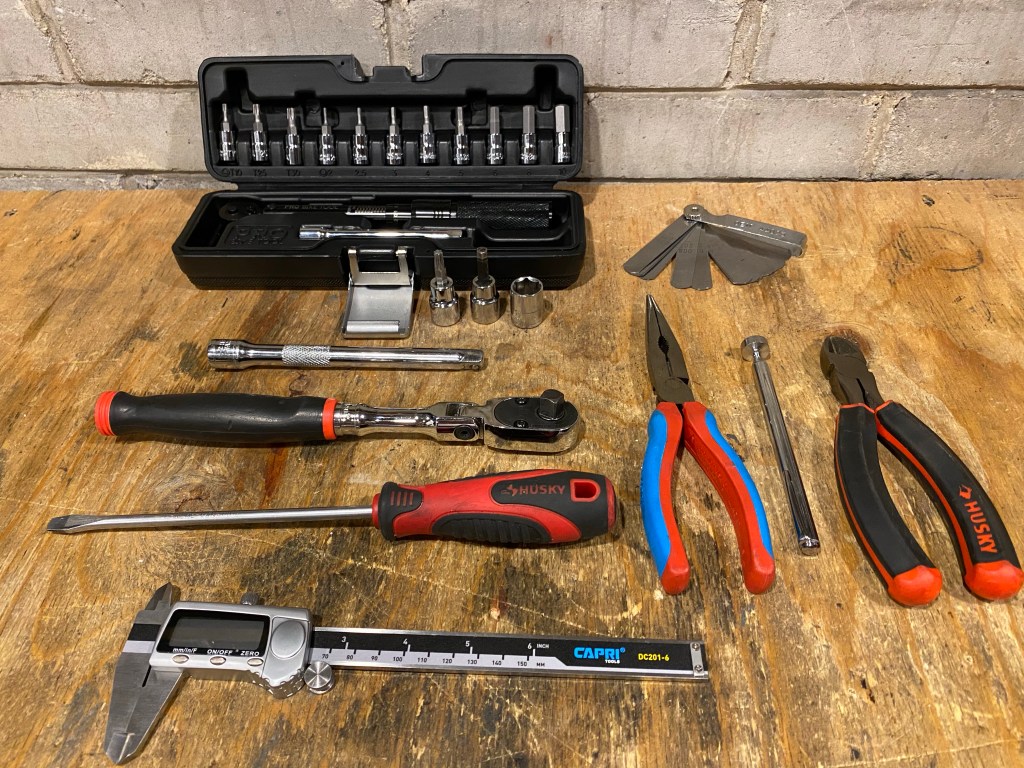 Ratchet, extension, socket set, hex set, torx set, torque wrench, pliers, long flathead screwdriver, feeler gauges, measuring calipers, magnet tool, 10W50 oil or assembly fluid, 10mm OD valve shims, zip ties, valve cover gasket (optional).