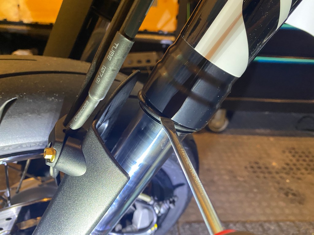 Since you are dislodging the oil seal, it’s normal that a small amount of fork oil will leak out. This is actually a good thing as gravity is pulling down the oil, but also the dirt that may be causing your problem. Often times, you will be able to see dirt or debris in the oil. Once you have cleaned all the way around the seal, wipe the fork tube down with a shop towel. Unless your fork has been leaking heavily for a long time, the small quantity of oil you lost is nothing to worry about.