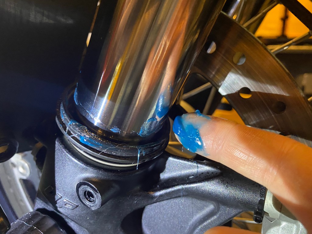 An often overlooked step in this process is to ensure the oil seal gets a good mechanical seal against the fork tube and to push down any remaining dirt. This is done by compressing thee fork immediately after cleaning it. Hold the front brake on your bike and bounce the fork 5-10 times as hard as you can. You will likely see a bit more oil on the fork which is normal.