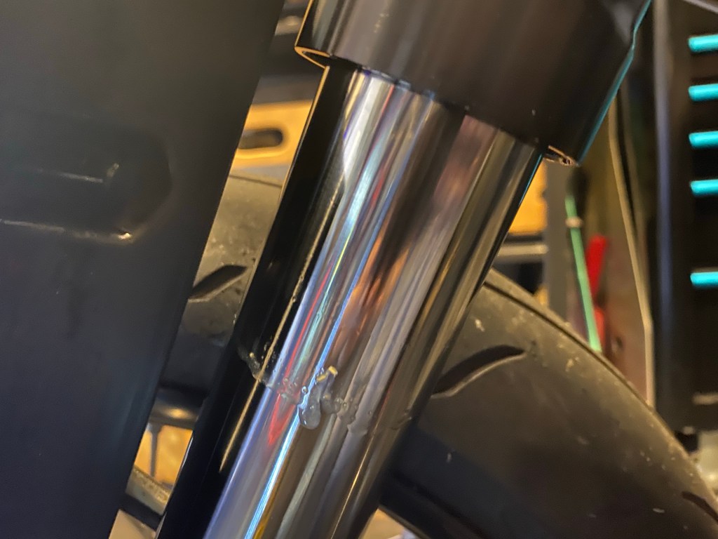 Wipe the fork clean and repeat the process a few more times. If, by the 2nd or 3rd time, the fork is still leaking oil, either the dirt is still preventing a proper seal (in which case you can try cleaning it again) or the oil seal may in fact be worn out (in which case you’ll need to remove the fork and replace the oil seal).