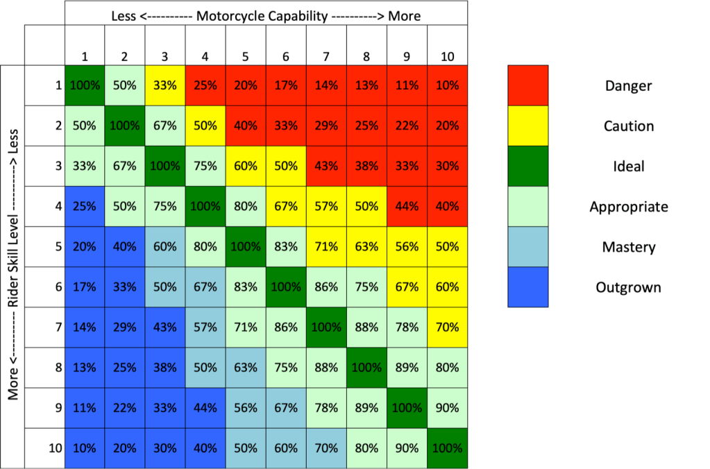 Appropriate: On either side of the Ideal like sits categories where there is a near perfect match between MC and RSL. On top of the Ideal zone, Appropriate is a match where the rider is still learning to maximize the potential of the bike but is much closer to achieving it than he would be in the Caution area of the matrix. Conversely, below the Ideal line, the Appropriate area designates riders who have begun progressing towards mastery and are getting enjoyment from understanding the limits of the machine and experiencing them safely and enjoyably. Either sides of the Appropriate zone are great places to be as a rider, offering different and rewarding experiences.