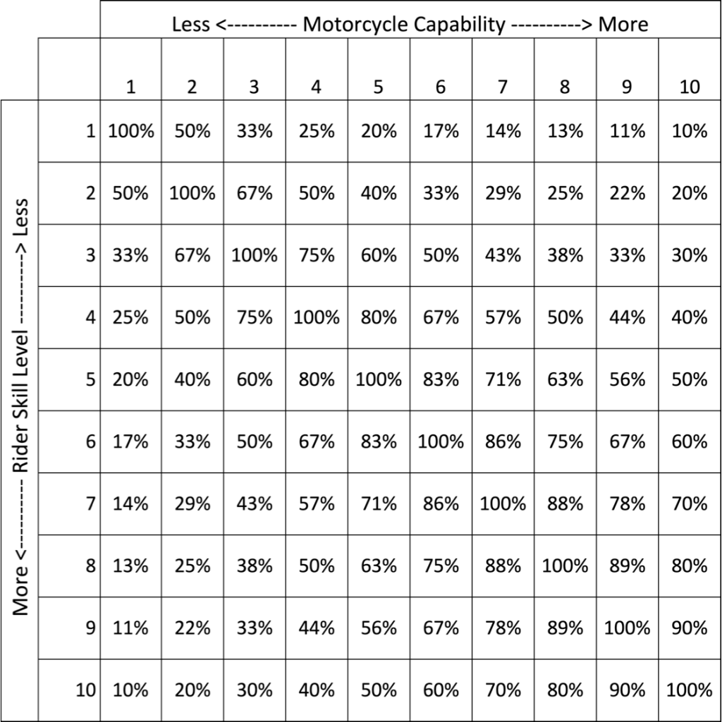 So, now that we have defined Motorcycle Capability and Rider Skill Level, we can begin correlating the two to better understand the dynamics at play. For this model, we use a simple formula: Recessive divided by Dominant where “Recessive” is the lower ranked value and “Dominant” is the higher ranked value. For example, if someone at RSL 5 is riding a motorcycle of MC 9, the recessive value would be the rider (smaller value of 5) and the dominant would be the bike (larger value of 9) or 5 divided by 9 = 0.56 (or 56%). Interestingly, this terminology already hints at “who is riding who” but let’s save that for later.