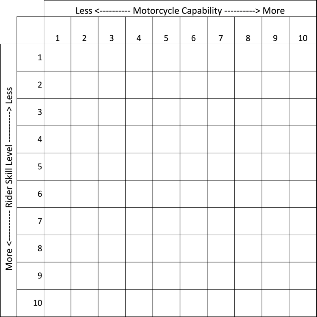 Let us first consider the 2 primary factors for this discussion: first: Motorcycle Capability and second: Rider Skill Level. Two subjective measures that, when correlated, create a very compelling matrix (as we will see later on).