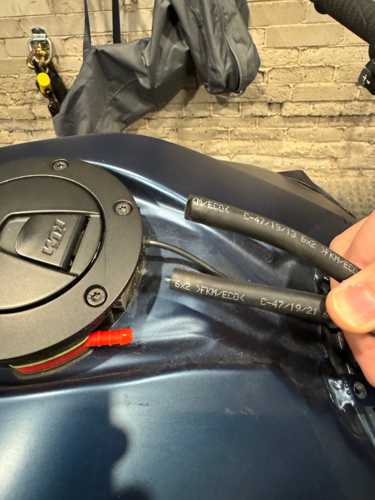 You will also need to disconnect the 2 breather hoses that connect to the OEM fuel cap. There is no hardware holding them in place so just pull them off.