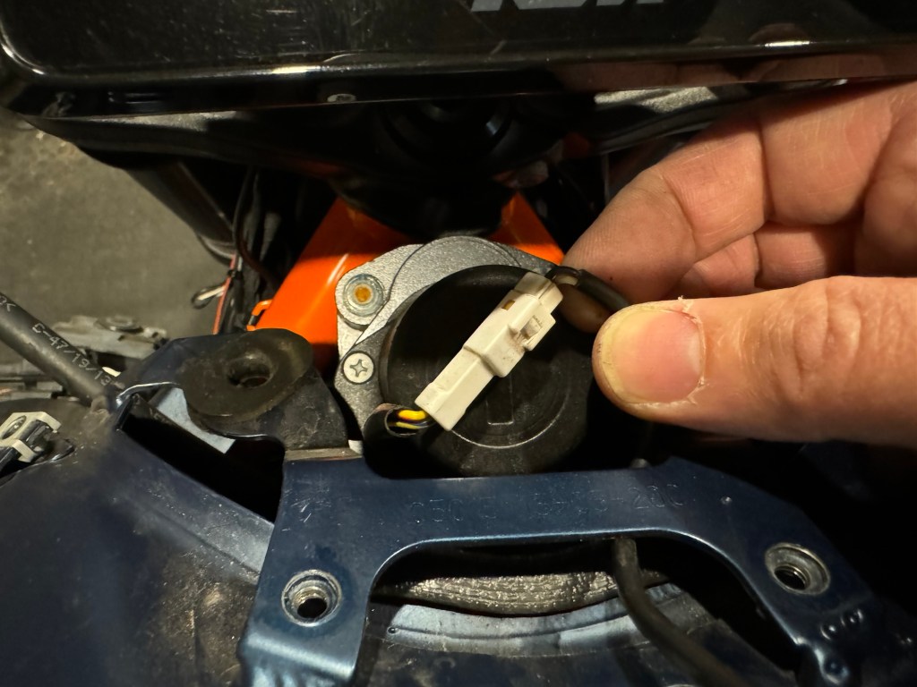 The next step to remove the right side panel from the bike is to lift up near the “key” as there is a male connector on the panel that plugs into a fitting on the bike.