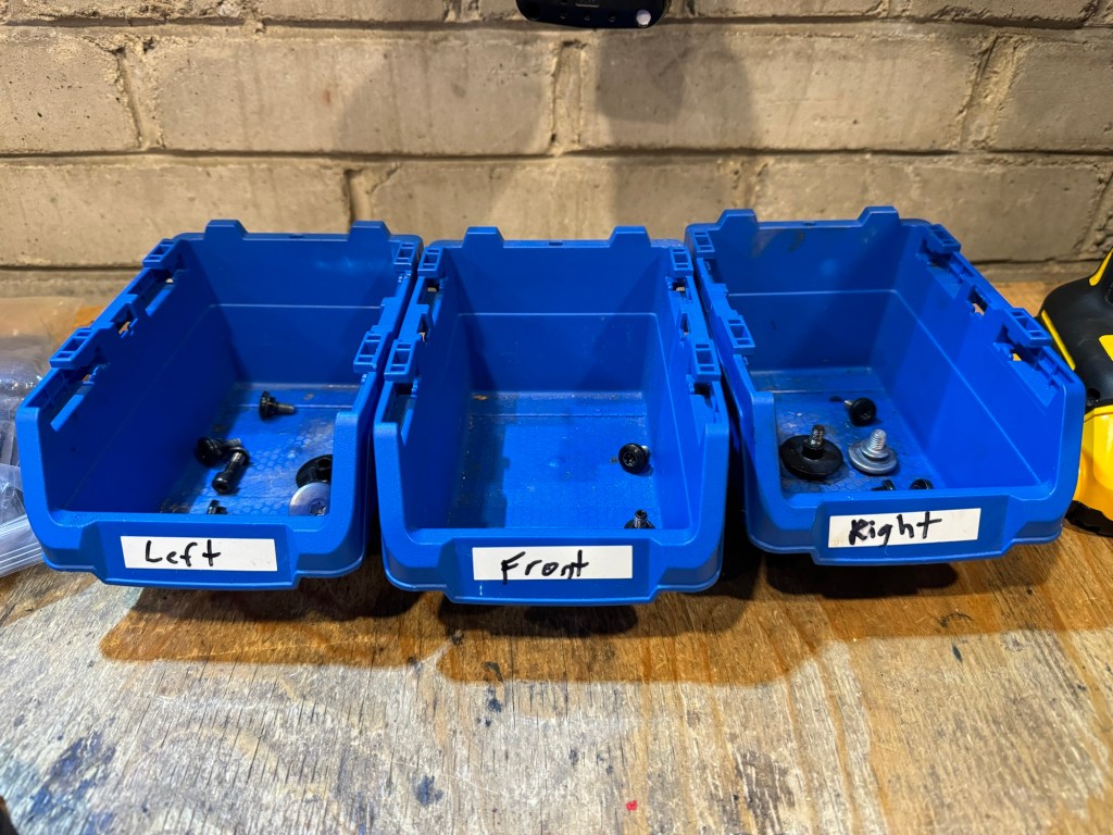 You’ll be taking a bunch of bolts off that secure 3 body panels to the bike. A few labeled bins or jars is a handy trick to make sure you put everything back correctly and don’t mix up or loose any bolts.